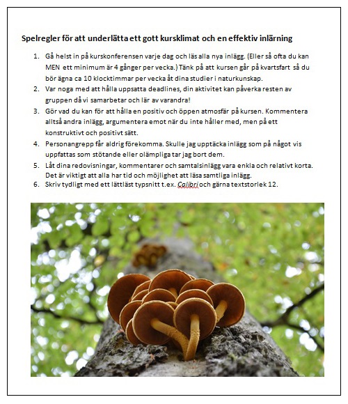 För att underlätta ett gott kursklimat och en effektiv inlärning kan det vara bra att sätta ihop gemensamma spelregler. Du som lärare kan i förväg tänka igenom vilka spelregler som du tycker är lämpliga för din kurs men om det är möjligt kan det även vara bra att låta deltagarna vara med vid utformningen av kursens spelregler. Erfarna distanslärare berättar att det är lättare att förstå och följa uppsatta regler om man själv har varit med och utformat dem. Ett bra tillfälle att utforma spelreglerna är vid kursens första närträff.